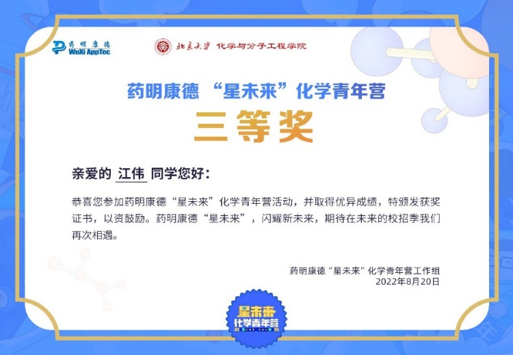 近日,糖心vlog 谢卫青教授课题组2021级博士研究生江伟同学在药明康德举办的第五届“星未来”化学青年营活动中荣获三等奖。
