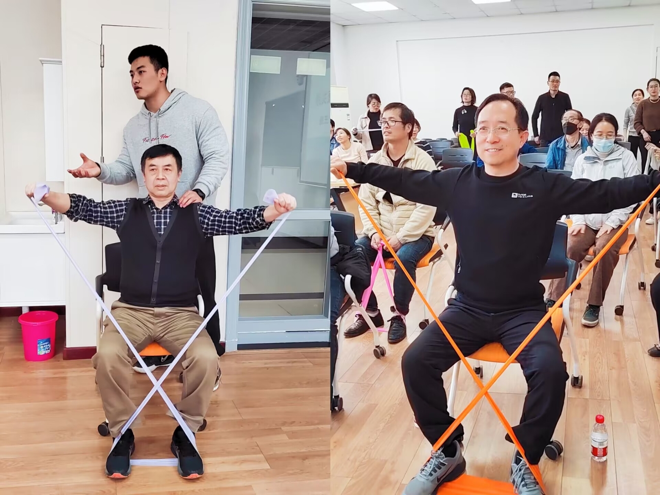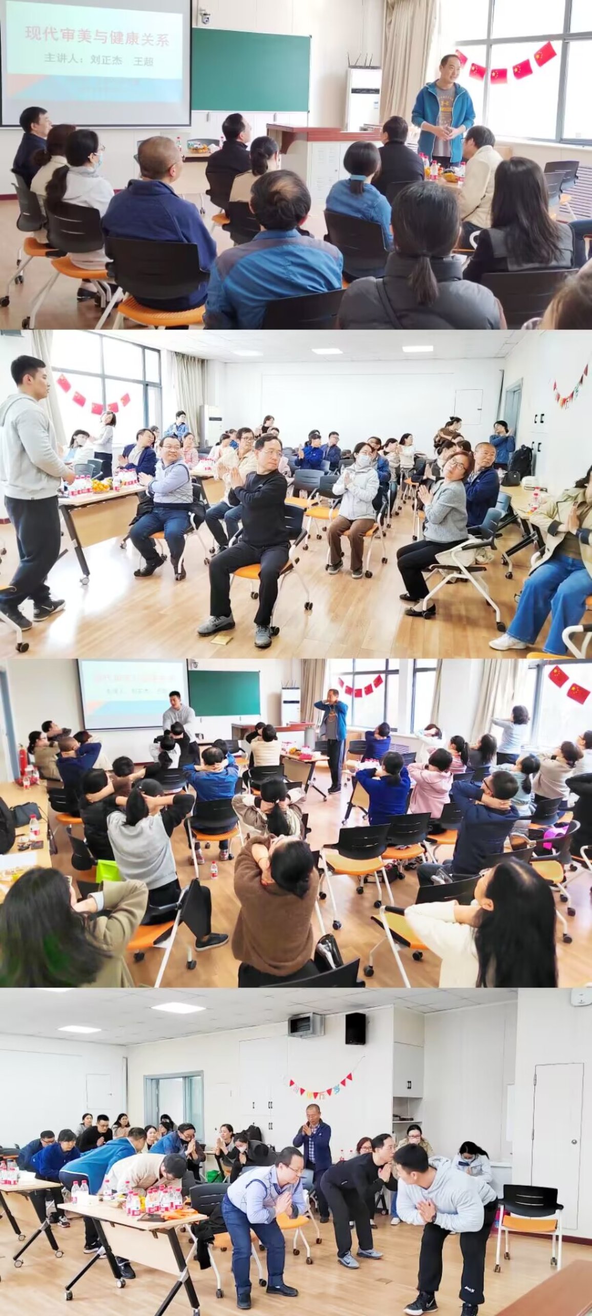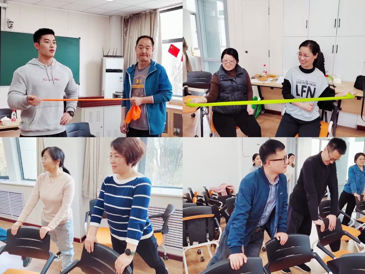 刘正杰老师首先讲解了现代审美与健康的关系,指出健康是形体美的基础,美感与健康关系是人越健康,越能够从内在透出人体美感;人体美感变化,是人体健康的天气预报。然而目前高校教师健康状态不容乐观,由于教学和科研任务繁忙,缺乏空余时间,教师普遍健身活动较少,健康意识淡薄,更缺乏科学的锻炼方法。基于此,他列举了目前高校教师常见的身体形态问题以及身体形态变化引起的健康隐患,并指出如何在日常工作办公中利用现有条件进行矫正训练。为了更好地以身示范,王超老师根据办公室人群的工作特点带动现场教师,针对颈部、背部、肩部、腰部、腿部等进行实操演练。几组训练下来,大家都感觉脖颈背部轻松了不少。